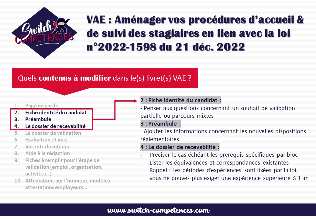 La LOI n° 2022-1598 du 21 décembre 2022 portant mesures d'urgence relatives au fonctionnement du marché du travail en vue du plein emploi apporte des modifications concernant le dispositif VAE. Ces modifications ont une répercussion sur votre livret VAE (livret 2) qu'il faudra modifier.